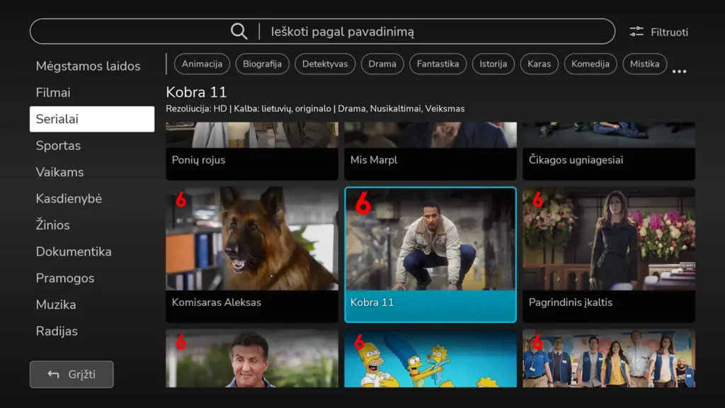 Ši funkcija leidžia patogiai rasti norimą filmą, serialą ar laidą. Turinys suskirstytas į kategorijas (pvz., Filmai, Serialai, Sportas) ir subkategorijas pagal žanrus. Viršuje esantis paieškos laukelis suteikia galimybę įvesti pavadinimą, o filtravimo įrankiai padeda tiksliau atrinkti turinį. Atrastas turinys rodomas su iliustracijomis, todėl pasirinkti tampa dar paprasčiau. Pasirinkus serialą, visos jo serijos patogiai pateikiamos vienoje vietoje.